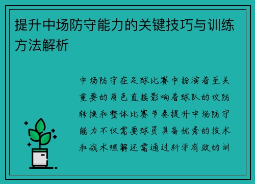 中场防守在足球比赛中扮演着至关重要的角色,直接影响着球队的攻防转换和整体比赛节奏。提升中场防守能力,不仅需要球员具备优秀的技术和战术理解,还需通过科学有效的训练方法来培养其防守意识和执行力。本文将从四个关键方面分析如何提升中场防守能力,包括防守站位与意识、身体对抗与力量训练、脚步移动与反应能力训练以及心理素质与比赛阅读能力。每个方面的训练方法都有其独特的重点,适当的结合和提升,能大幅度提升球员在中场防守中的表现。通过系统的训练,不仅可以强化球员的防守技巧,也能提升他们的整体比赛表现和对比赛局势的掌控能力。